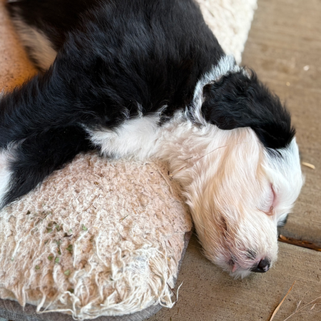 Sweet Dixie! She is one of our kids favorites. Dixie is playful, curious, loving and sweet. She tends to pile on top of her siblings when she sleeps, yet she loves to wrestle when she is awake and active. We never worry about her wondering as she stays with the pack and likes to socialize. Dixie has very pretty markings with an all white face (like her dad) but black markings all throughout. She has a cute white tip on her black tail. Dixie will snuggle every chance she can get with our kids but when it is time to play, she is all in.